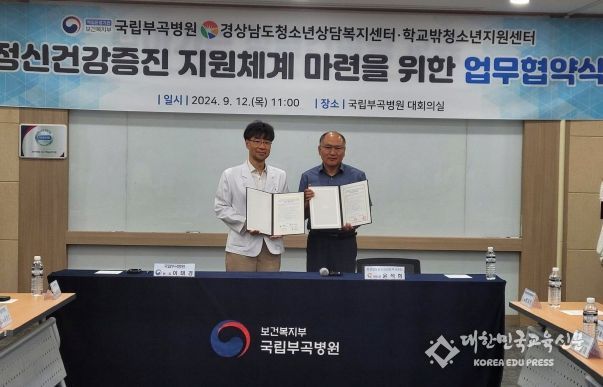 [대한민국교육신문] 진주시 학교밖청소년지원센터와 청소년상담복지센터는 12일 국립부곡병원과 ‘청소년 중독예방, 치유 및 정신건강 증진 지원체계 마련을 위한 업무협약’을 체결했다고 밝혔다.