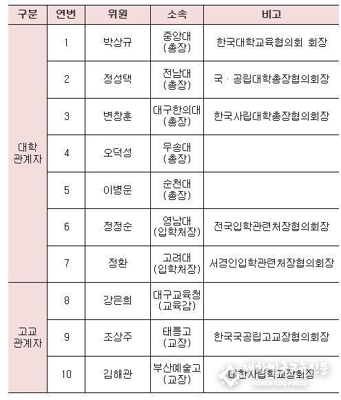 교육부는 지난해 12월에 발표한 「2028 대학입시제도 개편안」의 안정적인 정착과 현장 중심의 대입전형 개선 과제 발굴을 지원하기 위해 이번 협의회를 출범했으며, 본회의 위원으로 전문성과 대표성을 가진 대학 총장, 입학처장 등 대학 관계자와 교육감, 교장 등 고교 관계자 10인을 위촉했다.