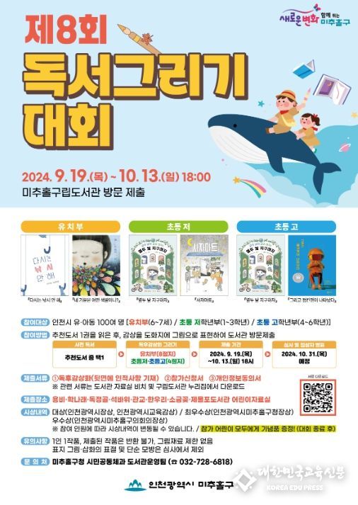 [대한민국교육신문] 인천 미추홀구 구립도서관은 인천 유·아동을 대상으로 자라나는 아이들의 독서력 증진과 창의력 개발을 위해 ‘제8회 독서 그리기 대회’를 개최한다고 19일 밝혔다.