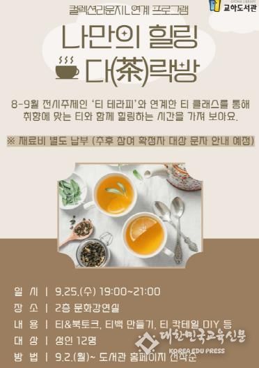 교하도서관 관계자는 “이번 프로그램은 참가자들이 차를 매개로 서로 소통하고 힐링할 수 있는 기회를 제공하고자 마련했다”라며 “많은 관심과 참여를 부탁드린다”라고 전했다.