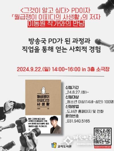 [대한민국교육신문] 파주시 교하도서관은 9월 22일 14시에서 16시까지 도서관 소극장에서 이동원 작가를 초청하여 방송제작자(PD)가 된 과정과 직업을 통해 얻은 사회적 경험에 대해 공유하는 시간을 갖는다.