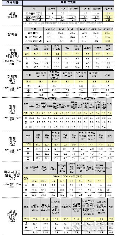 [대한민국교육신문] 교육부는 9월 26일, 17개 시도교육청이 실시한 2024년 1차 학교폭력 실태조사(전수조사) 결과와 2023년 2차 학교폭력 실태조사(표본조사) 결과를 발표한다.