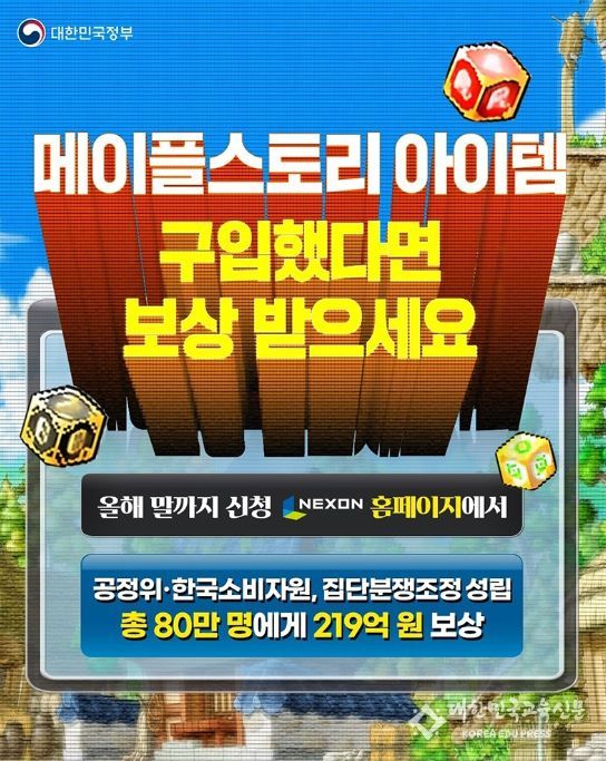 공정위의 제재조치에 이어 한국소비자원은 피해자 구제를 위해 직접 피해자를 모집, 집단분쟁조정 절차를 진행했어요. 그 결과 넥슨이 메이플스토리 아이템 구매자 80만 명에게 219억원 상당의 보상액을 지급합니다. 피해소비자 전체에 보상이 이루어지는 첫 사례, 역대 최대 규모의 보상 금액이라고 해요.