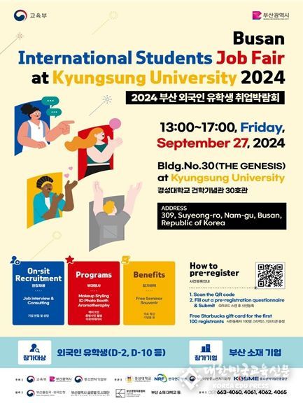[대한민국교육신문] 부산시는 내일(27일) 오후 1시 30분 경성대학교(총장 이종근) 건학기념관 30호관에서 '2024 부산 외국인 유학생 취업박람회'를 개최한다고 밝혔다.