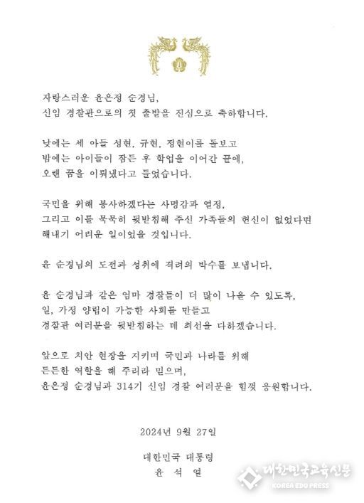 [대한민국교육신문] 윤석열 대통령은 9월 27일, 신임 경찰관 314기 졸업식에 참석한 윤은정 순경과 그 가족에게 조상명 국정상황실장을 보내 축하 서한과 선물을 전달했습니다. 윤 순경은 11살, 8살, 6살 세 아들의 어머니로서 아이들을 훌륭히 키우면서도 경찰관 준비를 병행하여 이번에 신임 경찰관으로 첫발을 내딛는 뜻깊은 자리에 섰다.