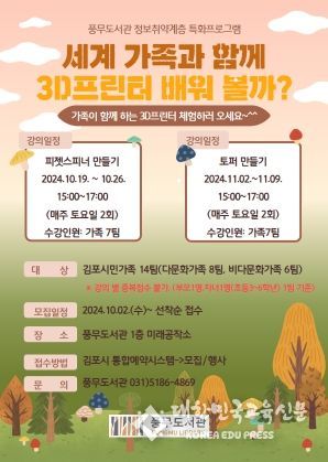[대한민국교육신문] 김포시 풍무도서관은 정보취약계층 특화 프로그램 ‘세계 가족과 함께 3D프린터 배워 볼까?’를 오는 10월 19일부터 11월 9일까지 매주 수요일 오후 3시에 풍무도서관 미래공작소에서 운영한다고 밝혔다.