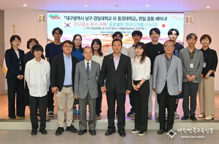 [대한민국교육신문] 대구 남구는 지난 9월 30일, 일본 동경대학교(경제학) 교수와 재학생 8명, 경일대학교(스마트경영학부) 배영자 교수를 비롯한 관계자들이 남구청을 방문하여 ‘대구 남구의 인구소멸 대응’에 대한 공동세미나를 개최하고, 앞산해넘이전망대 등을 탐방했다고 밝혔다.