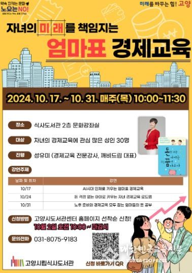 [대한민국교육신문] 고양특례시 식사도서관은 오는 10월 17일부터 10월 31일까지 저자특강‘자녀의 미래를 책임지는 엄마표 경제교육’을 운영한다.