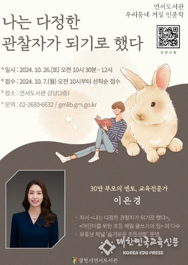 [대한민국교육신문] 광명시 연서도서관은 오는 26일 3층 강당에서 ‘우리동네 거실 인문학 강연회-나는 다정한 관찰자가 되기로 했다’를 개최한다.