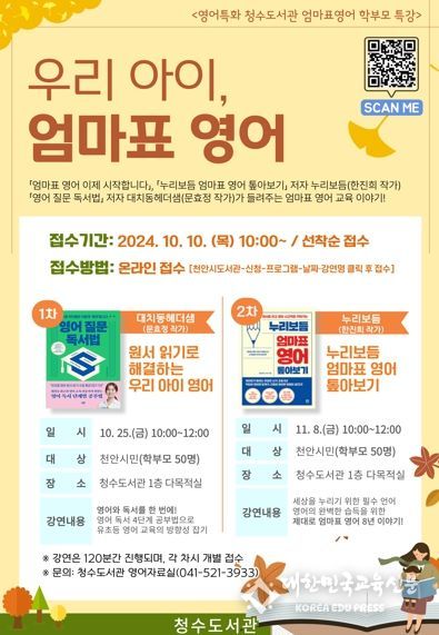 강연은 해당일 오전 10시부터 2시간 동안 청수도서관 1층 다목적실에서 진행되며, 자녀의 영어교육에 관심이 있는 학부모를 대상으로 선착순 50명까지 접수받을 예정이다.