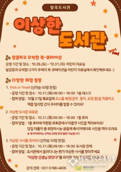 [대한민국교육신문] 김포시 양곡도서관은 10월 31일 목요일, ‘이상한 도서관’을 운영한다. 이는 시민들이 쉽게 찾고 즐길 수 있는 도서관을 만들기 위한 행사로 ▲달콤, 오싹을 주제로한 북큐레이션 ▲체험 활동 3종(이상한 도서관 포토존 , 이상한 사서를 찾아라 등) ▲독서문화 프로그램(불 꺼진 양곡도서관) 등 총 3개 분야 5개 프로그램으로 구성된다.