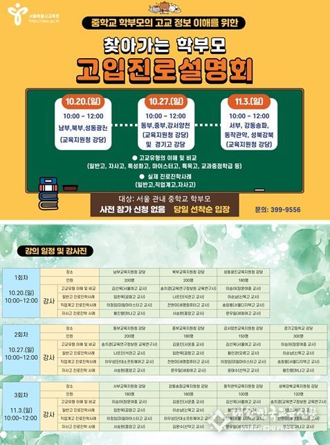 [대한민국교육신문] 서울특별시교육청은 10월 20일 27일, 11월 3일 3일에 걸쳐, 각 교육지원청 강당 등에서 '찾아가는 학부모 고입진로설명회'를 개최한다.