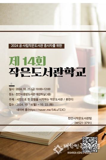 [대한민국교육신문] 천안시 도서관정책과(과장 박성자)는 오는 25일에 공·사립작은도서관 73개소 운영자(종사자)를 대상으로 ‘2024년 제 14회 작은도서관학교’를 운영한다고 16일 밝혔다.