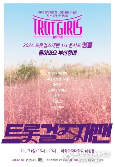 '2024 트롯걸즈재팬 1st 콘서트 앵콜 - 돌아와요 부산항에'가 오는 11월 17일 오후 3시와 7시 서울 이화여자대학교 삼성홀에서 개최된다.