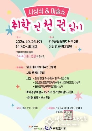 [대한민국교육신문] 완주군이 오는 26일 ‘취학 전 천 권 읽기’ 달성 기념 시상식을 중앙도서관에서 개최한다.