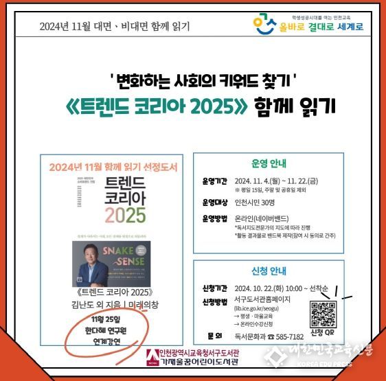 [대한민국교육신문] 인천광역시교육청서구도서관은 11월 4일부터 22일까지 ‘대면·비대면 함께 읽기’프로그램의 일환으로 ‘트렌드 코리아 2025 함께 읽기’를 운영한다.