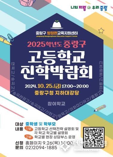 [대한민국교육신문] 중랑구가 오는 지역 내 고등학교 진학을 앞둔 학생과 학부모 500여 명을 대상으로 ‘2025학년도 중랑구 고등학교 진학박람회’를 개최한다.