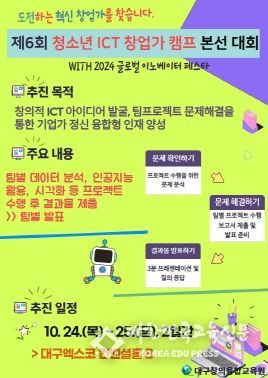 [대한민국교육신문] 대구창의융합교육원은 10월 24일부터 10월 25일까지 대구엑스코 컨벤션홀B에서‘제6회 청소년 ICT창업가 캠프 본선 대회’를 개최한다.