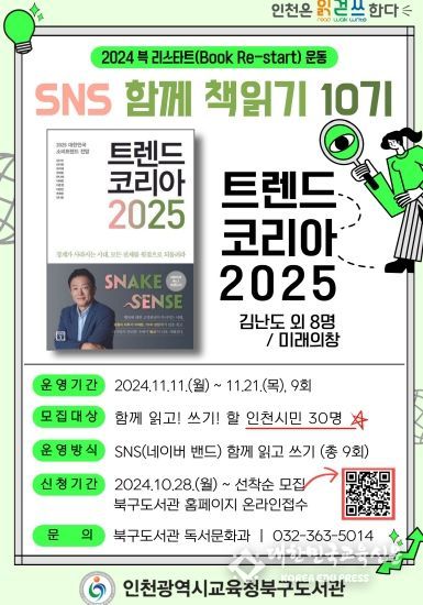 [대한민국교육신문] 인천광역시교육청북구도서관(관장 이재길)은 ‘트렌드 코리아 2025’를 주제 도서로 ‘SNS 함께 책 읽기’ 10기를 운영한다고 밝혔다.