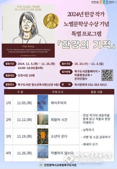 [대한민국교육신문] 인천광역시교육청북구도서관은 한강 작가의 노벨문학상 수상을 기념하여 특별 프로그램 ‘한강의 기적’과 작품 전시를 진행한다.