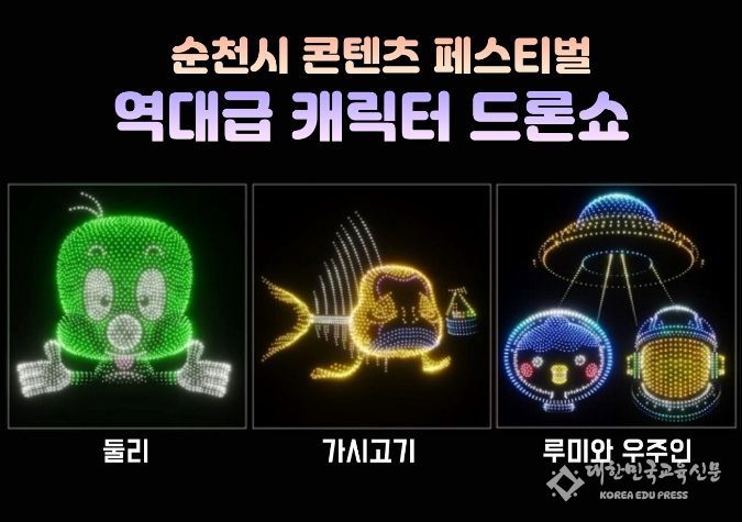순천에서 최초로 선보이는 이번 드론쇼는 ▲아기공룡 둘리 ▲공포의 외인구단(떠돌이 까치) ▲월리를 찾아라 등 다양한 캐릭터들로 오천그린광장 상공을 메운다고 해 벌써부터 시민들의 이목이 집중되고 있다.