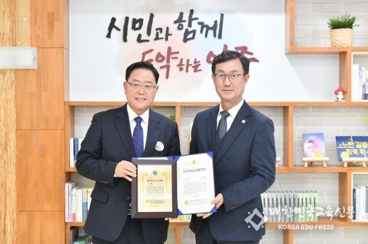 30일 오후 시청 2층 집무실에서 우중식 경기도체육회 이사가 강수현 양주시장에게 상패를 전달하고 있는 모습이다.