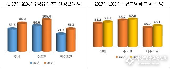 (수익용 기본재산) 2024년 사립대학(법인) 수익용 기본재산 확보율은 121.7%로 2023년(102.0%)보다 19.7%p 증가했다.