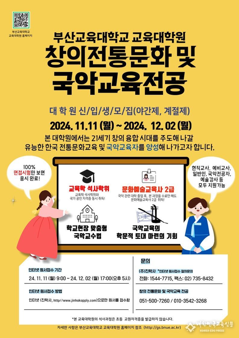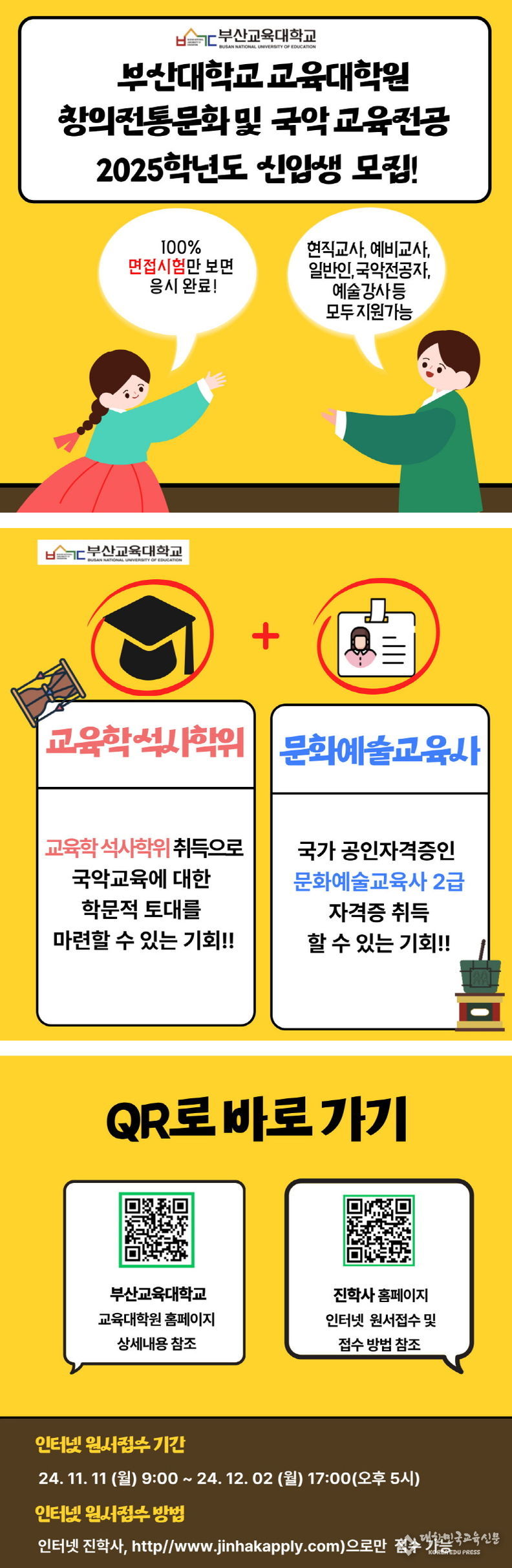 [대한민국교육신문] 부산교육대학교 교육대학원은 21세기 창의융합 시대를 주도해 나갈 유능한 한국 전통문화 및 국악교육자를 양성해 나가고자 2025년 대학원 신입생을 모집하고, 전형은 서류 접수 후 100% 면접만으로 진행한다.