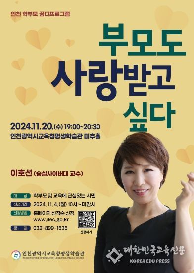 [대한민국교육신문] 인천광역시교육청평생학습관은 20일, 학부모 및 교육에 관심있는 시민을 대상으로‘이호선 숭실사이버대 교수 초청’ 학부모 꿈디 프로그램 특별강연을 진행한다.