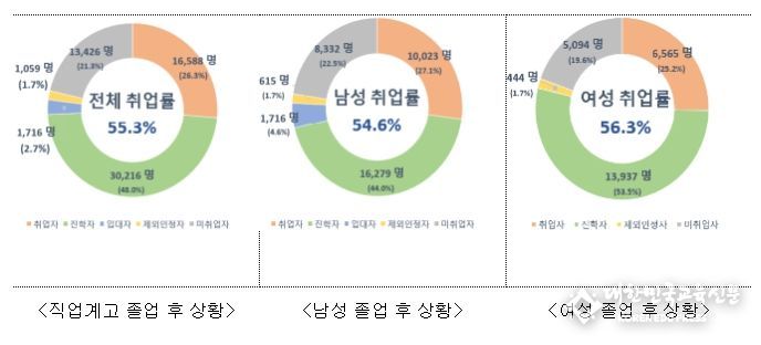 학교 유형별 취업률은 마이스터고가 72.6%로 직업계고 중 가장 높았으며, 특성화고 52.3%, 일반고 직업반 43.9%로 나타났다. 지역별로는 경북(69.5%), 대구(65.3%), 대전(61.1%), 경남(59.5%), 세종(59.4%), 충남(58.2%), 강원(56.2%), 광주(55.9%) 8개 시도가 전체 취업률 평균(55.3%)보다 높았다.