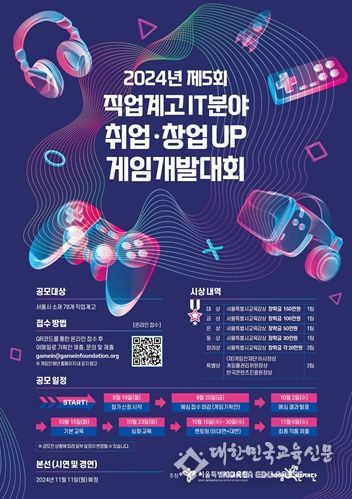 [대한민국교육신문] 서울특별시교육청은 직업계고 학생들의 IT분야 취업·창업 역량강화를 목표로 11일, 에스플렉스센터(마포구 상암동)에서 ‘2024년 제5회 직업계고 IT분야 취업·창업UP 게임개발대회 본선 대회’를 개최한다.