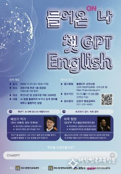 [대한민국교육신문] 부산시 금정구는 부산외국어대학교 RIS시민영어교육센터와 협업하여 오는 11월 27일 오후 3시 금정구청 1층 대강당에서 ‘들어온(ON)나, 챗GPT English’특강을 개최한다.