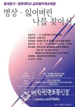 [대한민국교육신문] 동대문구가 경희대학교 글로벌미래교육원과 협력해 운영하는 ‘명상-잃어버린 나를 찾아서’와 ‘문화답사-후기 백제의 역사와 문명, 부여’ 강좌의 수강생을 선착순으로 모집한다.