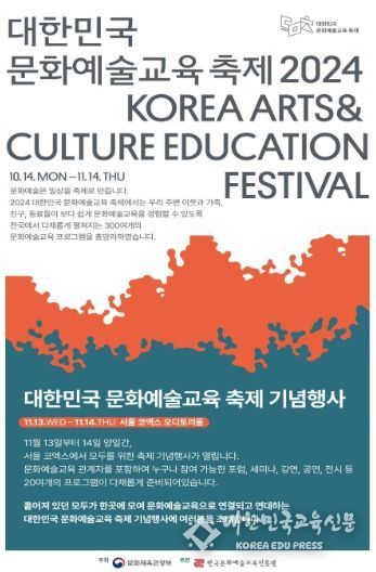 [대한민국교육신문] 문화체육관광부는 한국문화예술교육진흥원과 함께 11월 13일과 14일, 서울 코엑스에서 ‘2024 대한민국 문화예술교육 축제’ 기념행사를 개최한다. 10월 14일부터 한 달 동안 열고 있는 ‘문화예술교육 축제’의 대미를 장식하는 이번 행사에서는 문화예술교육 토론회와 문화예술교육 발전 유공자 표창, 문화예술교육 사업성과 공유, 학술 세미나 등을 통해 미래 문화예술교육 방향성을 모색한다.