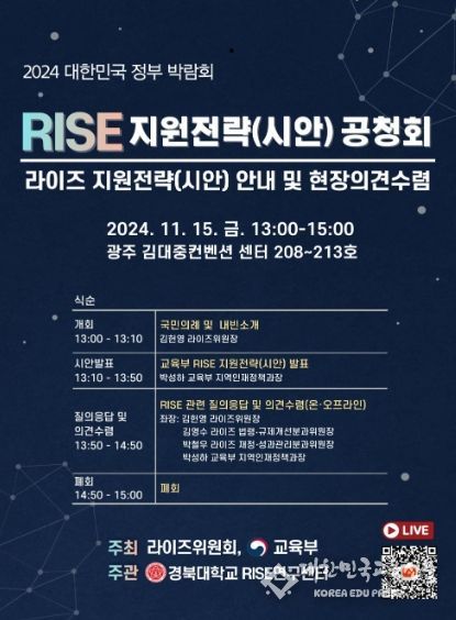 [대한민국교육신문] 교육부와 라이즈위원회는 11월 15일 김대중컨벤션센터(광주)에서 ‘라이즈 지원 전략(시안)’에 대한 대국민 공청회를 개최한다.
