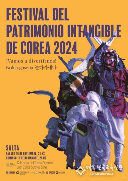 [대한민국교육신문] 국가유산청 국립무형유산원은 11월 16일과 17일, 24일 총 3회에 걸쳐 아르헨티나 살타 중앙극장(Teatro Provincial Juan Carlos Saravia)과 부에노스아이레스 국립 사르미엔토 문화센터(Palacio Libertad, Centro Cultural Domingo Faustino Sarmiento)에서 한국 무형유산의 가치를 세계에 알리기 위한 글로벌 교류 공연 'K-무형유산 페스티벌-놀다가세나'를 개최한다.