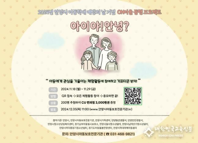[대한민국교육신문] 안양시는 오는 29일까지 아동학대 예방의 날(11. 19.)을 기념해 관내 유관기관과 함께 ‘온라인 아동학대 연합캠페인’을 진행한다.