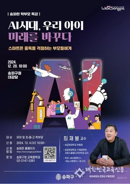 [대한민국교육신문] 송파구가 오는 20일 10시 구청 대강당에서 ‘AI시대, 우리아이 미래를 바꾸다’를 주제로 학부모 특강을 개최한다고 알렸다.