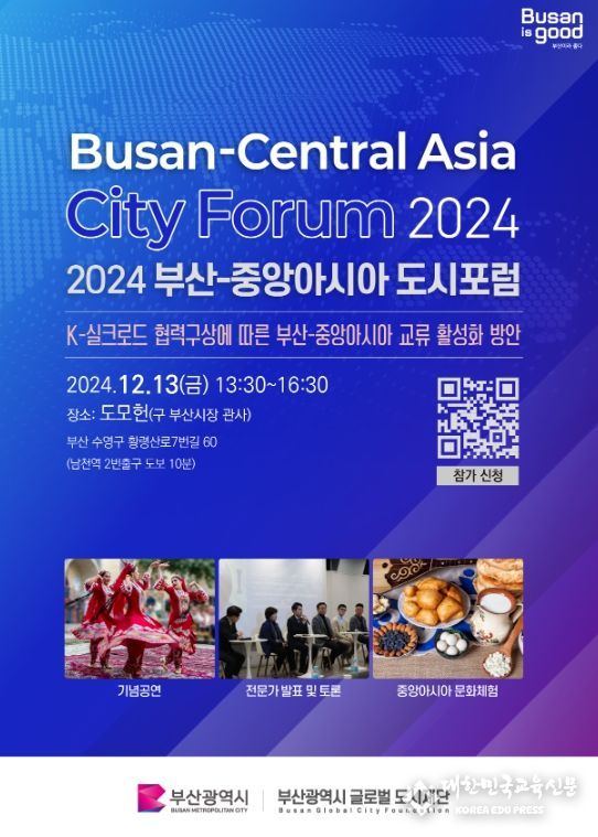 [대한민국교육신문] 부산시와 부산글로벌도시재단은 오는 12.13. 오후 1시 30분부터 도모헌에서 부산-중앙아시아 도시포럼을 개최한다고 밝혔다.