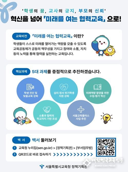 정근식 서울시교육감은 위원회에서 제시한'미래를 여는 협력교육'을 서울교육이 실현하고자 하는 교육비전으로, ‘학생의 꿈, 교사의 긍지, 부모의 신뢰’를 비전을 실현하기 위해 중심에 두는 가치인 교육지표로 하고, △모두를 위한 맞춤형 교육 △창의와 상생의 미래역량 교육 △자치와 참여의 교육공동체 △안전하고 행복한 학교 △공감과 소통의 찾아가는 행정을 비전과 지표를 구체화하기 위한 정책의 주요 목표인 5개의 정책방향으로 설정했다.