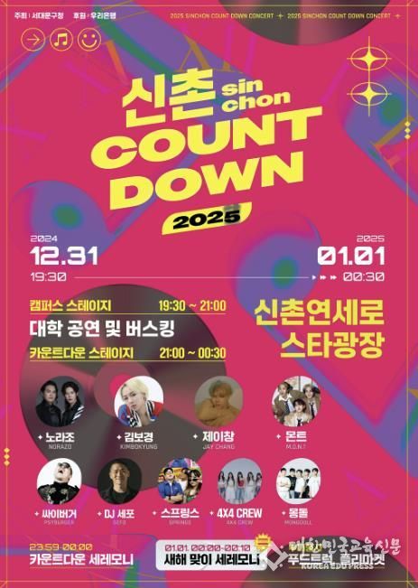 [대한민국교육신문] 서대문구가 올해의 마지막 날인 이달 31일 저녁 7시 30분부터 새해 첫날인 1월 1일 0시 30분까지 신촌 연세로 스타광장에서 ‘2025 신촌 카운트다운 콘서트’를 개최한다.