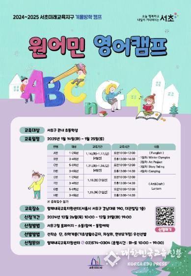 서초구는 내년 1월 13일부터 2주간 학생들의 영어 실력 향상과 과학적 호기심을 자극하는 ’원어민 영어캠프’, ‘과학실험 캠프’를 운영한다. 방학 동안 유익하고 재미있는 프로그램을 통해 정서적, 학습적 성장을 도모한다는 취지다.