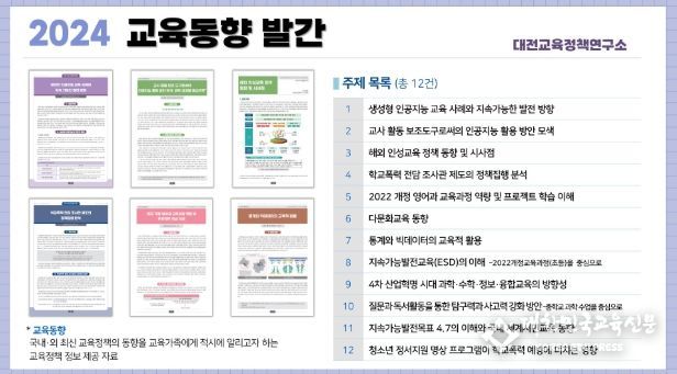 대전교육정책연구소의 교육동향은 생성형 인공지능, 2022 개정 교육과정, 통계와 빅데이터 활용 교육, 지속가능발전교육, 다문화교육, 인성교육, 세계시민교육 등의 교육 이슈가 포함되어 교육가족에게 최신 교육트렌드를 공유하고, 실질적이며 깊이 있는 정보를 제공했다.