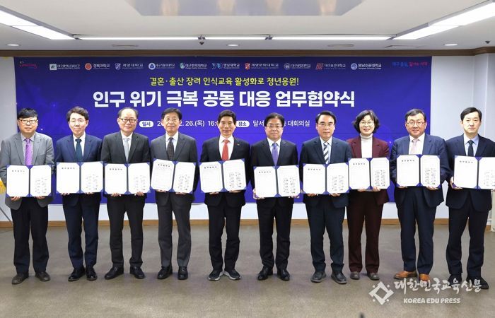 이번 업무협약은 달서구와 9개 대학이 비혼·저출산 문제로 심화되는 국가적 인구 위기 속에서 청년층을 대상으로 결혼·출산·가족 가치관에 대한 긍정적인 인식을 확산하고, 건강한 가정의 중요성을 알리기 위해 마련됐다. 달서구와 경북대, 계명대, 대구가톨릭대, 대구한의대, 영남대, 계명문화대, 대구공업대, 대구보건대, 영남이공대 등 9개 대학은 함께 힘을 모아 인구 위기 극복 공동 대응을 위한 교육적 협력을 강화하기로 했다.