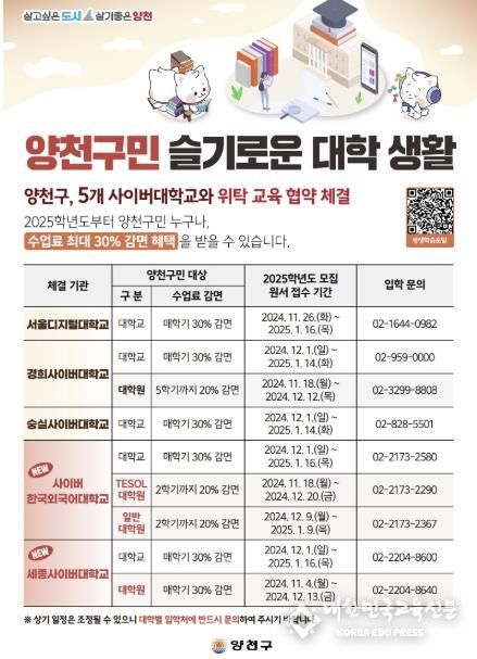 이들 대학과의 협력을 통해 양천구민은 누구나 매 학기 수업료 30% 감면 혜택을 받을 수 있다. 사이버대학교 신청 마감은 학교별 다소 상이하므로 자세한 사항은 대학 입학처에 문의하면 된다.