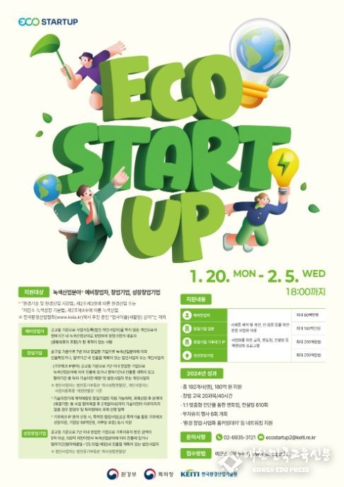 환경부는 ‘에코스타트업 지원사업’에 내년도 새롭게 시작하는 특허청의 ‘공공 특허기술 활용 기후테크 성장지원 사업’을 접목하여, 1월 20일부터 2월 5일까지 ‘2025년도 에코스타트업 지원사업’에 참여할 녹색산업분야 예비창업자·창업기업을 공동으로 모집할 계획이라고 밝혔다.