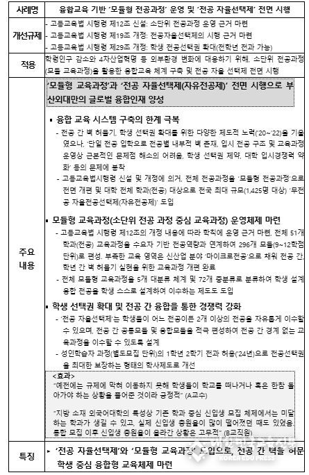 부산외국어대학교는 전체 51개 학과(전공) 교육과정을 296개 소단위 전공과정(모듈 교육과정)으로 전면 개편하고 전체 학과(전공) 대상으로 전국 최대 규모(1,425명 대상)의 무전공 자율전공선택제를 도입했다. 경상국립대학교는 빅데이터, 항공·드론, 반도체 등 12개 분야 55개 소단위 전공과정을 신설하여 미래전략산업 인재 양성에 힘을 기울이고 있다.