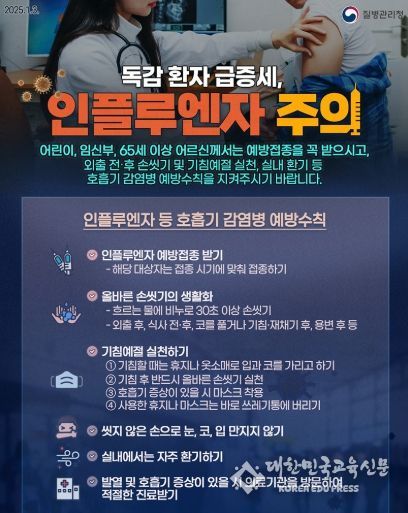 [대한민국교육신문] 어린이, 임신부, 65세 이상 어르신께서는 예방접종을 꼭 받으시고, 외출 전·후 손씻기 및 기침예절 실천, 실내 환기 등 호흡기 감염병 예방수칙을 지켜주시기 바랍니다.