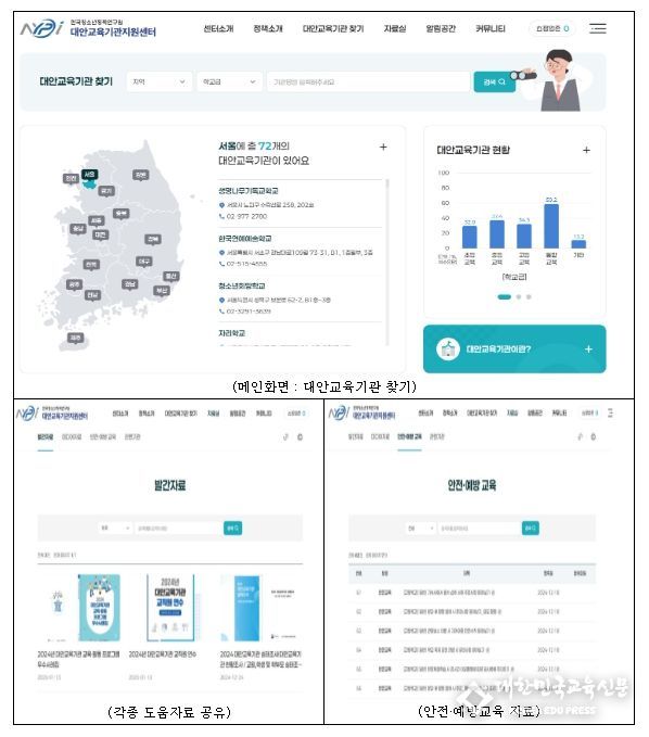 ‘대안교육기관 지원센터’ 누리집은 대안교육기관에 관심 있는 학생·학부모 등에게 시도교육청에 등록된 대안교육기관별 운영 정보를 제공하며, 대안교육기관의 교육활동을 지원하는 다양한 도움 자료를 공유하기 위하여 구축됐다.