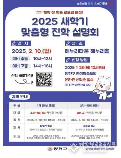 한편 구는 지난해 9월 개관한 ‘구립 양천교육지원센터’를 거점으로 맞춤형 설명회와 일대일 컨설팅 교육 등을 활발히 운영하고 있다. 특히 올해는 시기별 진학설명회와 권역별 소규모 특강을 연 25회로 확대하고 일대일 컨설팅은 2,800명 이상 지원해 더 많은 학부모와 학생들에게 꼭 필요한 학습·진학·진로 정보를 원스톱으로 제공할 계획이다.